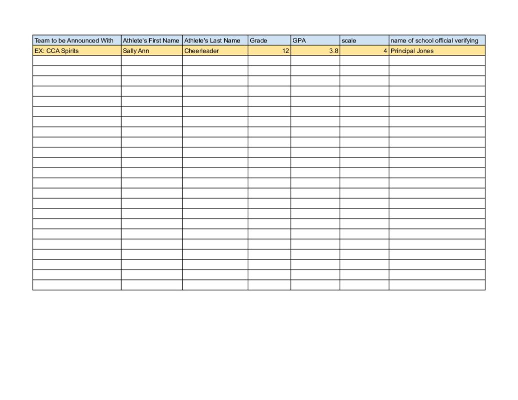 PLEASE SUBMIT A GOOGLE SHEET OR EXCEL FILE IN THE FORMAT PICTURED BELOW. PLEASE HAVE A SCHOOL OFFICIAL SIGN TO VERIFY AND SUBMIT TO THE CCA OFFICE NO LATER THAN Feb 20, 2026. NO FORMS WILL BE ACCEPTED AFTER THAT TIME. THESE SHOULD BE EMAILED TO INFORMATION@CHEERCCA.COM
